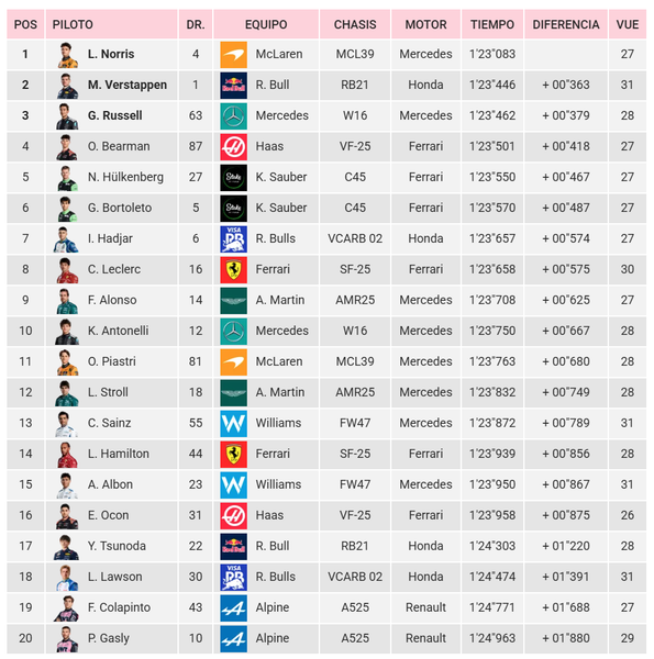 Patricio O'Ward es la novedad más destacada de la sesión, pues estará en el McLaren de Oscar Piastri Fernando Alonso no estará en estos Libres 1 y por ende, Carlos Sainz será el único representante español Los Libres 1 de Abu Dabi siempre suelen tener un aire a test de 'rookies' desde que se introdujo esta normativa y así será también en esta edición. Muchos equipos aprovecharán este fin de semana para cumplir con sus últimas obligaciones en lo que a pilotos jóvenes respecta. Desde que en 2022 entró en vigor la normativa de que los pilotos oficiales tenían que ceder sus monoplazas para varias sesiones de Libres 1 a pilotos jóvenes, hemos visto muchas caras nuevas en Abu Dabi. Es lo habitual, al ser un fin de semana con formato tradicional, un circuito con muchas escapatorias y que todos conocen. Si bien suele puede haber grandes cosas en juego, como es el caso del Mundial de Pilotos con Lando Norris, Oscar Piastri y Max Verstappen, muchos equipos han querido guardarse esta bala para Abu Dabi. Norris Uno de ellos ha sido McLaren, que tendrá que sentar a Piastri en los Libres 1 para dejar sitio a Patricio O'Ward, que vuelve al coche para su segundos Libres 1 de la temporada. El mexicano ya ha rodado en Libres 1 y en los test de Abu Dabi con McLaren en los últimos años y volverá a ser igual en 2025. Lewis Hamilton tampoco estará en esta sesión, ni tampoco Fernando Alonso. El asturiano ha cedido su asiento a Cian Shields, un piloto que no ha sumado puntos ni en Fórmula 3 ni Fórmula 2. Aston Martin será el único equipo con dos 'rookies', siendo uno el mencionado Shields y el otro Jak Crawford, en lugar de Lance Stroll. La mencionada ausencia de Hamilton hará que por segunda vez en la historia, los hermanos Leclerc compartan equipo en una sesión de Fórmula 1. Lo hicieron el año pasado y vuelven a repetirlo en 2025. Tras Dino Beganovic y Antonio Fuoco, el monegasco es el tercer piloto diferente que rodará con el SF-25 en unos Libres 1. Carlos Sainz sí que estará en estos Libres 1. Será Alexander Albon quien ceda su coche a Luke Browning. Lo mismo con Franco Colapinto, también presente y con Pierre Gasly sentado en el muro. Paul Aron ocupará su lugar. Sólo Mercedes y Sauber están exentos de rodar con un 'rookie' en estos Libres 1 de Abu Dabi. Los dos ya han cumplido con todas las sesiones obligatorias y serán los únicos que no lleven a cabo cambios en sus alineaciones durante el fin de semana. PILOTOS JÓVENES LIBRES 1 ABU DABI McLaren: Patricio O'Ward Red Bull: Arvid Lindblad Ferrari: Arthur Leclerc Williams: Luke Browning Racing Bulls: Ayumu Iwasa Aston Martin: Jak Crawford y Cian Shields Haas: Ryo Hirakawa Alpine: Paul Aron https://soymotor.com/f1/noticias/los-libres...ios-confirmados -------------------- "El Foro es y será, siempre, mi Segunda Casa"
