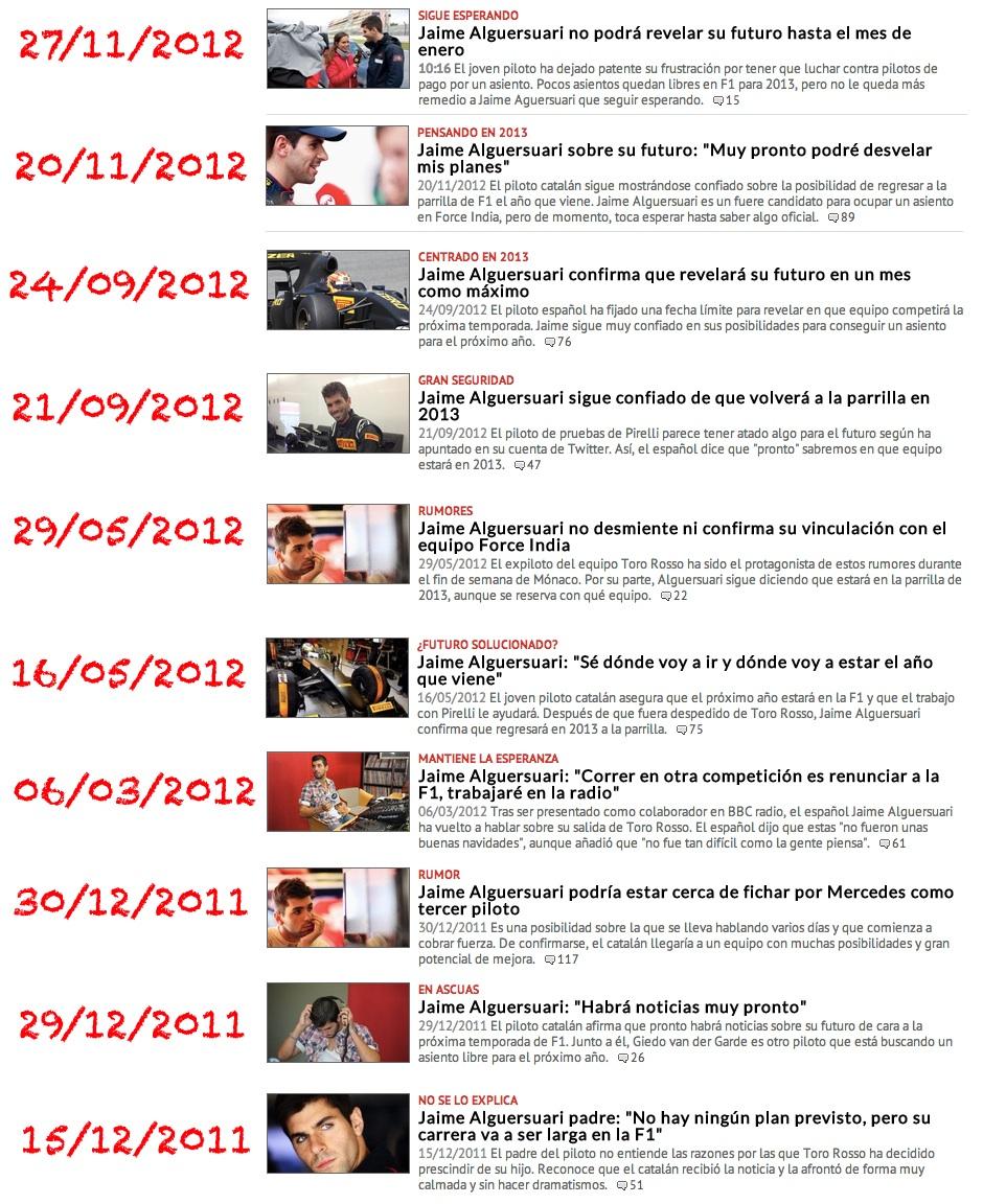 Alguersuari: Por una serie de razones que no puedo anticipar, es probable que no pueda comunicar dónde estaré en 2013 hasta el mes de enero Resumiendo, todo lo que ha estado diciendo no era más que una bacalá con pedigrí de competicion. Vamos lo mismo que Pedro todos estos años sin dar publicidad al asunto. A pelear como un jabato por los restos que quedan. -------------------- |