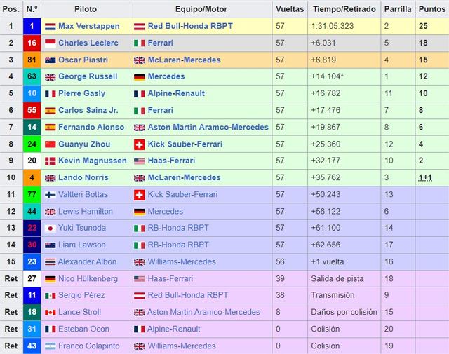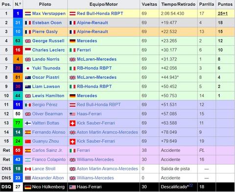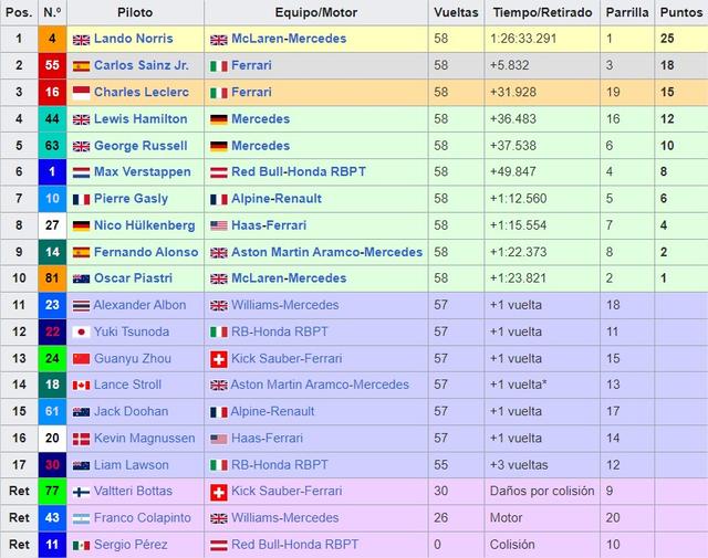 Último GP del año, ya van 16 años GP tras GP con lo previos. Como siempre, millones de gracias a cada uno de vosotros por estar y mantener viva este pequeña familia. GRAN PREMIO DE ABU DHABI 2025 05-06-07 Diciembre del 2025 Yas Marina Primer Gran Premio: 2009 Longitud: 5,281 kms Duración de la Carrera: 58 vueltas (306,183 kms) Record Vuelta Rápida: 1:28.637 – Kevin Magnussen (2024) Piloto con más victorias: Lewis Hamilton (5) Piloto con más poles: Lewis Hamilton (5) Equipo con más victorias: Red Bull (7) Equipo con más poles: Red Bull (7) Web Oficial del Circuito Trazado del Circuito: ![]() El circuito desde Google Maps Coordenadas para Google Earth: 24°28′N 54°22′E El Circuito Una vuelta al circuito con Lando Norris Ganadores del GP de Abu Dhabi: 2009 Sebastian Vettel (Red Bull) 2010 Sebastian Vettel (Red Bull) 2011 Lewis Hamilton (McLaren - Mercedes) 2012 Kimi Raikkonen (Lotus – Renault) 2013 Sebastian Vettel (Red Bull) 2014 Lewis Hamilton (Mercedes) 2015 Nico Rosberg (Mercedes) 2016 Lewis Hamilton (Mercedes) 2017 Valtteri Bottas (Mercedes) 2018 Lewis Hamilton (Mercedes) 2019 Lewis Hamilton (Mercedes) 2020 Max Verstappen (Red Bull) 2021 Max Verstappen (Red Bull) 2022 Max Verstappen (Red Bull) 2023 Max Verstappen (Red Bull) 2024 Parrilla 2024 ![]() Resultados 2024 ![]() Tiempo meteorológico para el GRAN PREMIO DE ABU DHABI TOPIC PREVIO/CARRERA GP ABU DHABI 2024 HORARIOS Viernes. 10:30 Libres 1 14:00 Libres 2 Sábado. 11:30 Libres 3 15:00 Clasificación Domingo. 14:00 CARRERA Horario de emisión de DAZN: DAZN