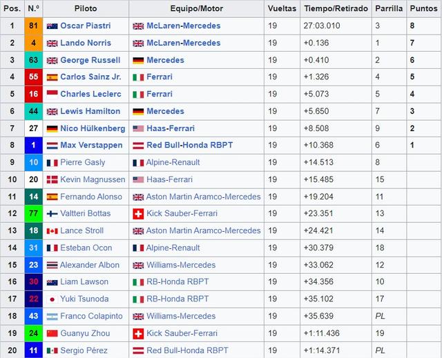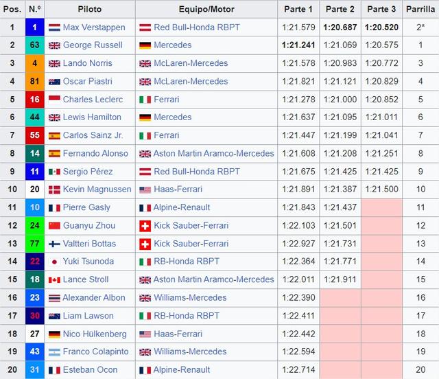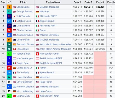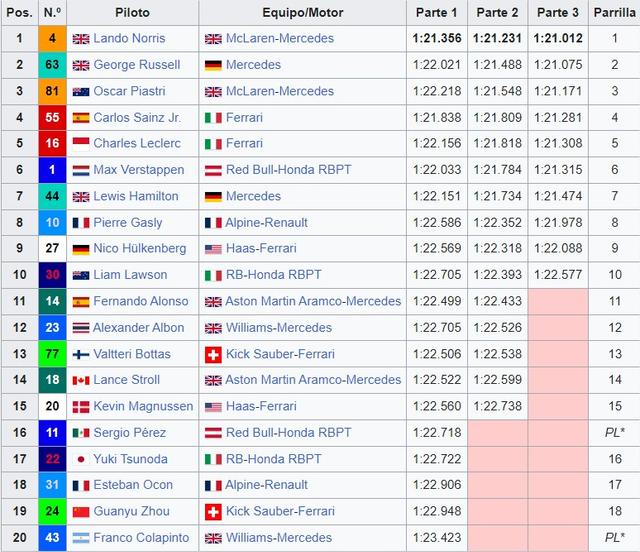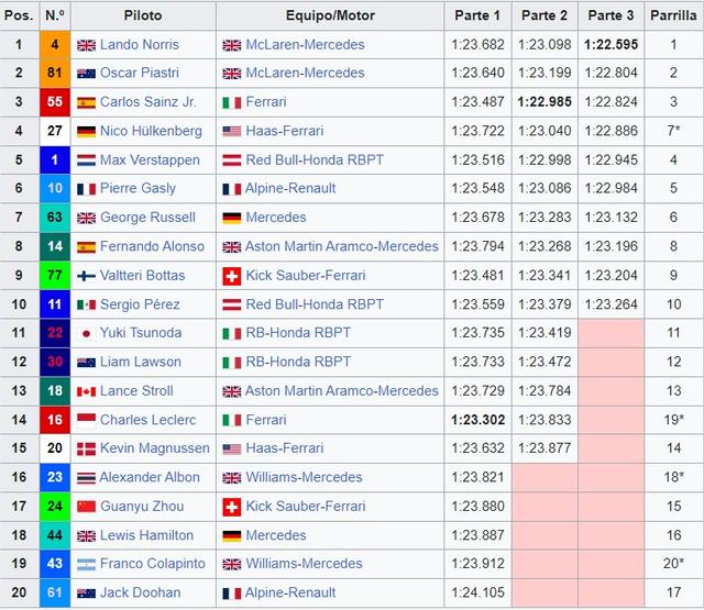 GRAN PREMIO DE QATAR 2025 28-29-30 de Noviembre del 2025 Doha Primer Gran Premio: 2021 Longitud: 5.419 m Duración de la Carrera: 57 vueltas (308.611km) Web Oficial del Circuito Trazado del Circuito: ![]() El circuito desde Google Maps El Circuito Vuelta onboard Ganadores del GP de QATAR: 2021 Lewis Hamilton (Mercedes) 2023 Max Verstappen (Red Bull) 2024 Max Verstappen (Red Bull) Sprint Shootout 2024 Sprint 2024 ![]() Parrilla 2024 Resultados 2024 ![]() TOPIC PREVIO/CARRERA GP QATAR 2024 Tiempo meteorológico para el GRAN PREMIO HORARIOS Viernes. 14:30 Libres 1 18:30 SPRINT CLASIFICACIÓN Sábado. 15:00 SPRINT 19:00 CLASIFICACIÓN Domingo. 17:00 CARRERA Horario de emisión de DAZN: DAZN