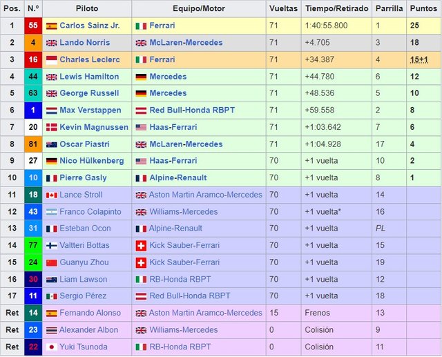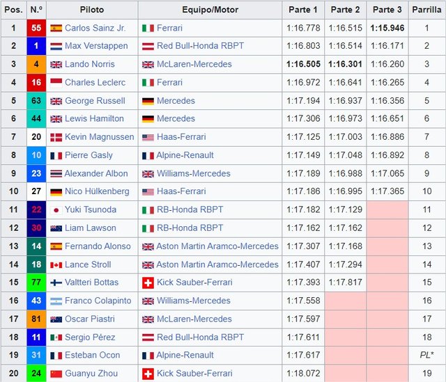 GRAN PREMIO DE SINGAPUR 2025 03-04-05 de Octubre del 2025 Singapur Primer Gran Premio: 2008 Longitud: 4.940m. Duración de la carrera: 62 vueltas (306.143km) Record Vuelta Rápida: 1:34.486 Daniel Ricciardo – RB (2024) Piloto con más victorias: Sebastian Vettel (5) Piloto con más poles: Lewis Hamilton – Sebastian Vettel (4) Equipo con más victorias: Mercedes – Red Bull - Ferrari (4) Equipo con más poles: Ferrari (7) Web Oficial del Circuito Trazado del Circuito: ![]() Circuito de Marina Bay Coordenadas para Google Earth: 1°17'26.07" N 103°51'41.97" E El circuito desde Google Maps El Circuito Una vuelta onboard junto a Lando Norris (Mclaren) Ganadores del GP de SINGAPUR: 2008 Fernando Alonso (Renault) 2009 Lewis Hamilton (McLaren - Mercedes) 2010 Fernando Alonso (Ferrari) 2011 Sebastian Vettel (Red Bull - Renault) 2012 Sebastian Vettel (Red Bull – Renault) 2013 Sebastian Vettel (Red Bull – Renault) 2014 Lewis Hamilton (Mercedes) 2015 Sebastian Vettel (Ferrari) 2016 Nico Rosberg (Mercedes) 2017 Lewis Hamilton (Mercedes) 2018 Lewis Hamilton (Mercedes) 2019 Sebastian Vettel (Ferrari) 2022 Sergio Pérez (Red Bull) 2023 Carlos Sainz (Ferrari) 2024 Lando Norris (Mclaren) Parrilla 2024 ![]() Resultados 2024 ![]() TOPIC PREVIO/CARRERA GP SINGAPUR 2024 HORARIOS Viernes. 11:30 Libres 1 15:00 Libres 2 Sábado. 11:30 Libres 3 15:00 Clasificación Domingo. 14:00 CARRERA Horario de emisión de DAZN: DAZN